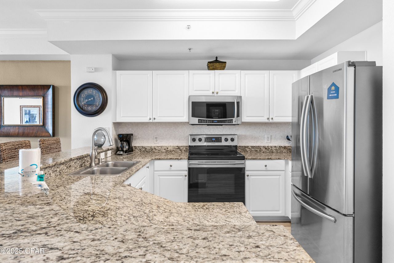 PRICED TO SELL!!! From the moment you open the door to this 3 bedroom, 3 bath condo on the 6th floor of Tidewater Beach Resort, you'll know you've found the perfect property! As you enter, take in the gorgeous sight of the Gulf through the oversized double sliding glass doors in the living room, or enjoy the essence of the Emerald Coast from the beautiful balcony. With bar height chairs, a large dining table, and comfy couches, you and your guests will have plenty of seating whether relaxing or enjoying a bite to eat. The kitchen is well equipped with stainless steel appliances, granite countertops, and more than enough cabinet space to make meal-time easy. To be sure that everyone has the privacy they need to rest and relax, this condo offers three generously-sized bedrooms. The primary bedroom boasts a gorgeous bay window to take in the incredible view, an entrance to the balcony, and an extensive ensuite. In the bathroom, you'll find a double vanity, garden tub, separate shower, and walk-in closet. The secondary bedroom is open and comfortable, and also has an ensuite bath, allowing your guests to enjoy their own separate space. The third bedroom is perfect for the kiddos with two beds, a wall-mounted TV, and easy access to the guest bathroom in the hall. Finally, the unit comes with an in-unit full-sized washer and dryer to make laundry convenient for the duration of your stay. With private access to the beach, multiple swimming pools, on-site bar and cafe, workout facilities, sauna, game room, and private movie theater, you'll never have to leave the property. If you do want to venture out, this condo is only minutes from all the Panama City hotspots, including Pier Park and a variety of sailing, fishing, and water sport options. Whether you're looking for a home away from home or a fantastic source of rental income, you've just found it in this spacious, stunning condominium!
