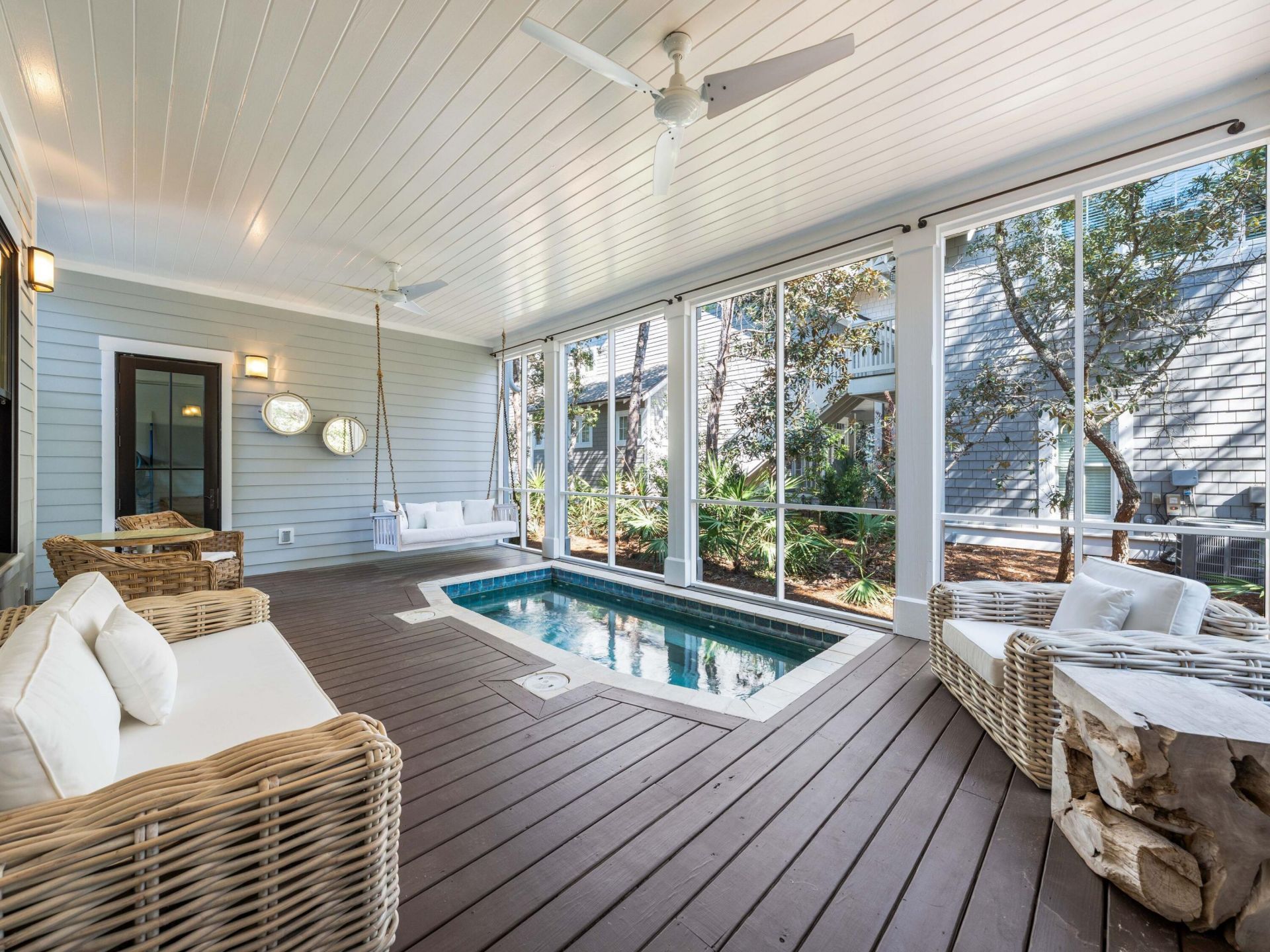 Located along a tranquil street within the exclusive WaterSound Beach community, this furnished residence offers a serene retreat with four bedrooms, four full baths and one powder bath. An expansive 1,700 square feet of outdoor porches includes a spacious screened porch that features a private 14-foot spa. The sunlit open concept living and dining areas provide ample space for family gatherings, complemented by hardwood floors and intricate board and batten wall details.The kitchen is a culinary haven, featuring a spacious center island adorned with marble countertops, custom cabinetry, and stainless appliances, including a wine refrigerator. A comfortable guest suite with ensuite and powder bath are conveniently located on the first level. Ascend to the upper level to discover a spacious secondary living area complete with four built-in bunks. The master suite exudes opulence, characterized by a vaulted tongue and groove ceiling, a wraparound balcony, and an ensuite bath.The second floor further enhances the property with an additional guest suite with ensuite and laundry. A spacious carriage house provides a welcoming space for guests, situated above the garage that accommodates one car and a golf cart. Recent enhancements include updated decorative lighting, furnishings, exterior painting, and enhanced landscaping.The gated WaterSound Beach community, strategically located south of Scenic Highway 30A, offers homeowners a rare sense of seclusion while providing convenient access to a variety of recreational activities. Amenities include swimming pools, multiple parks, green spaces, a state-of-the-art fitness center, and private boardwalks leading to one of the most picturesque mile stretches of coastline in the region.